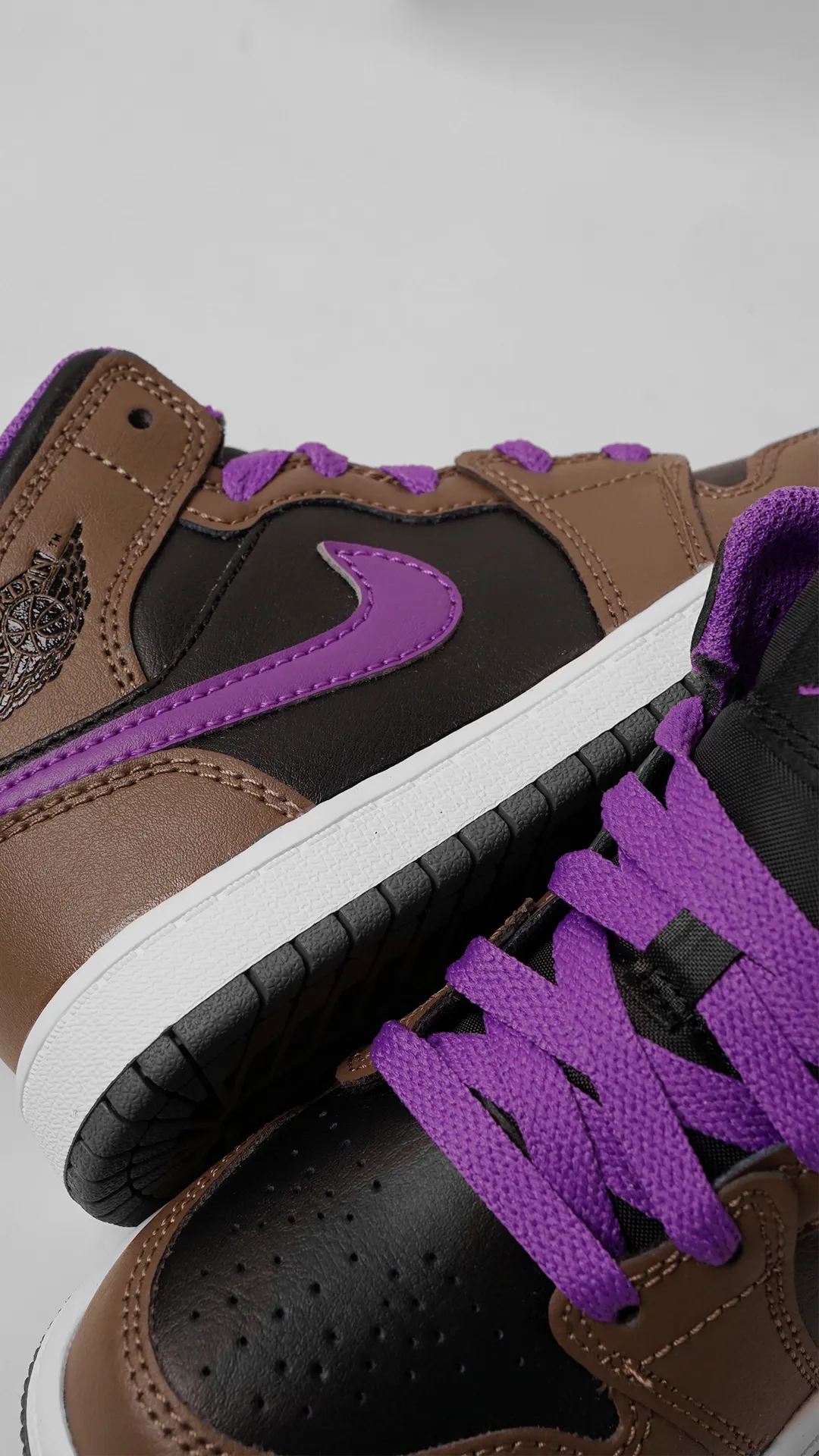 AJ 1 yang hadir dalam 3 warna coklat, hitam, dan Wild Berry. Dasar berbahan kulit berwarna hitam dan permukaan coklat ditekankan dengan aksen kontras berwarna Purple.